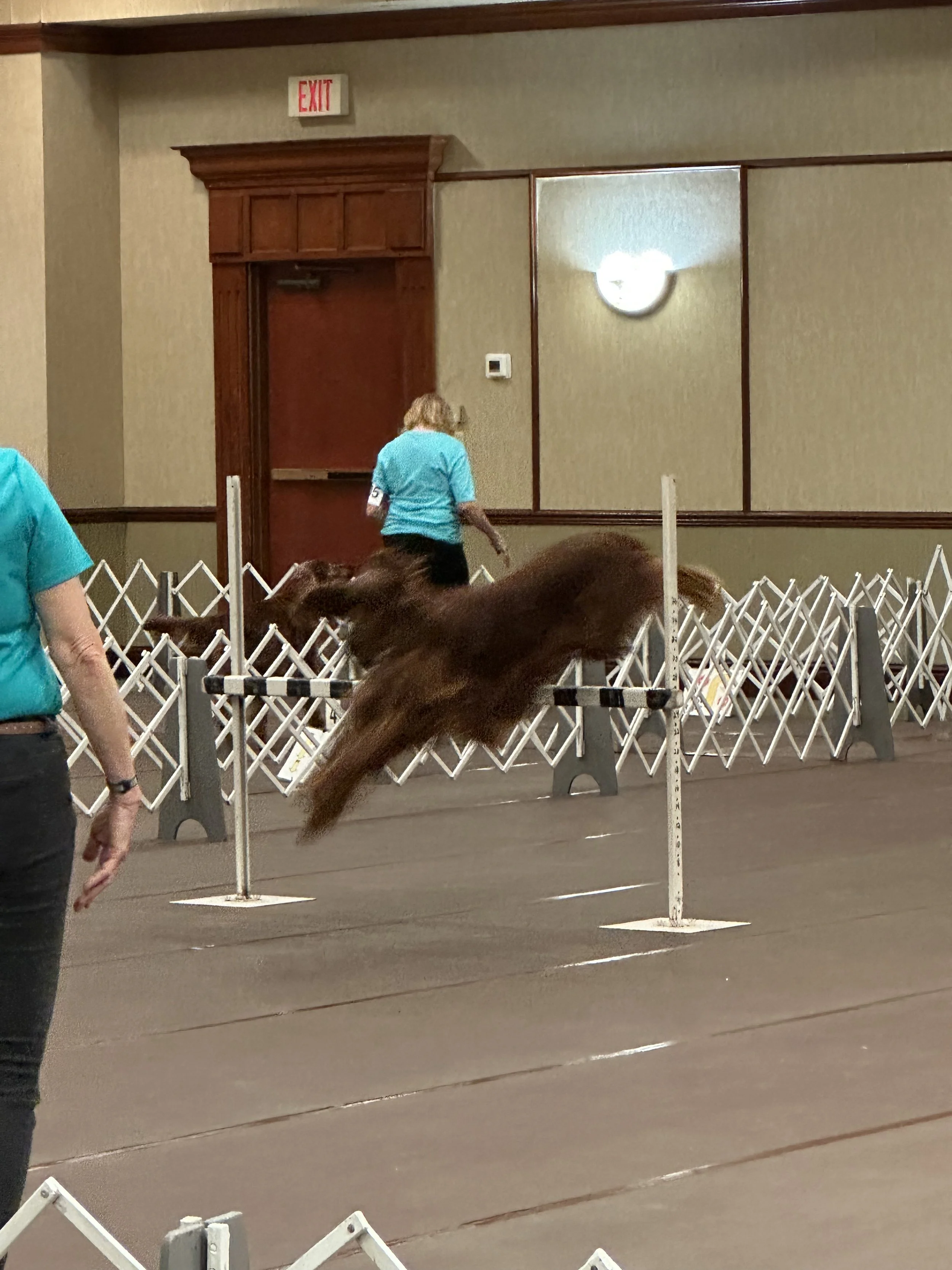 Irish Setters are an athletic Breed; they were built to hunt, to run a field chasing birds, all-day-long! Agility is a sport in which their natural athleticism and intelligence really shines! They may not be the speediest competitor but there is nothing more beautiful than a mahogany Irish Setter sailing over a jump on a Fall day. Of course, on occasion their “class clown” will show up, making you laugh through any embarrassment, as they joyfully wag their tail - laughing with you!